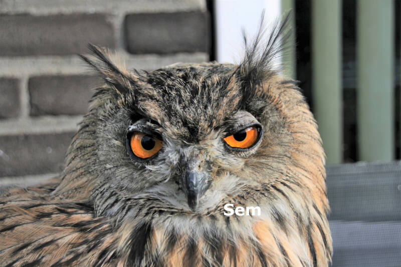 Sem heeft het buiten goed naar de zin. Alleen 's morgens en 's avonds mag hij naar binnen om te eten. Dan maken we eerst zijn riempje los en wandelt hij zelf al naar binnen. Drempel over en dan begint hij te schetteren. Dan moet hij op de handschoen. De ene keer gaat dit prima en de andere keer heeft hij geen zin. en dat laat hij duidelijk horen. Inmiddels weten we ook dat Sem een man is. Door een bloedpen (veer met bloed) op te sturen naar Laboratorium in Bielefeld kunnen ze het geslacht bepalen en kunnen we een citis-vergunning aanvragen.